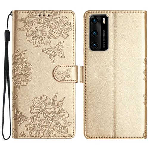 Funda para Huawei P40 Cherry Blossom Butterfly Skin Feel de PU en Relieve (Oro)