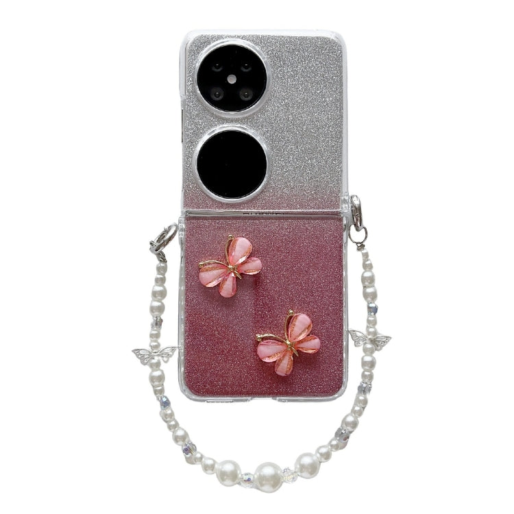 Funda para Huawei P50 Pocket Glitter Powder 3D Butterfly PC Hebilla Lateral Cobertura Total con Pulsera de Perlas (Rojo)