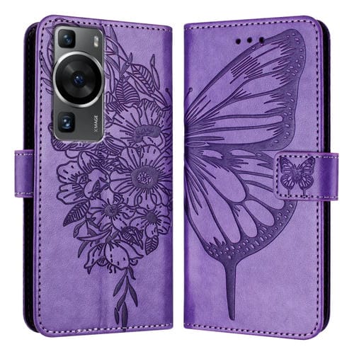 Funda de Cuero Huawei P60 / P60 Pro con Mariposa en Relieve (Púrpura)