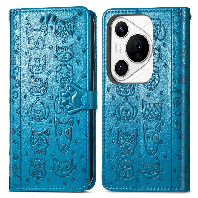 Funda de Cuero para Huawei Pura 70 Ultra con Relieve Perros y Gatos (Azul)