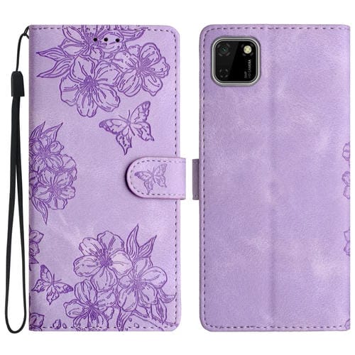 Funda para Huawei Y5P Honor 9S de PU con Mariposa y Flor de Cerezo en Relieve (Púrpura)