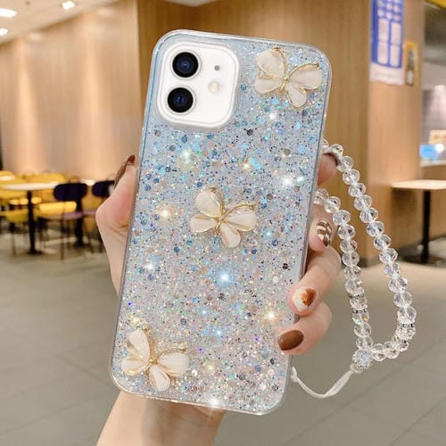 Funda para Teléfono TPU Epoxi iPhone 11 con Mariposa de Jade y Lentejuelas Estrelladas con Correa (Plateada)