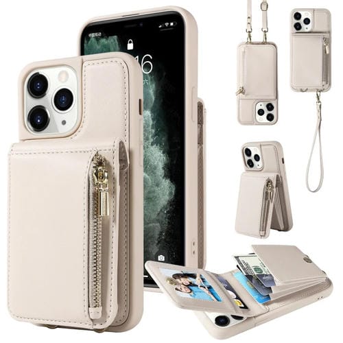 Funda para iPhone 11 Pro Crossbody Lanyard Zipper Wallet de Cuero (Beige)