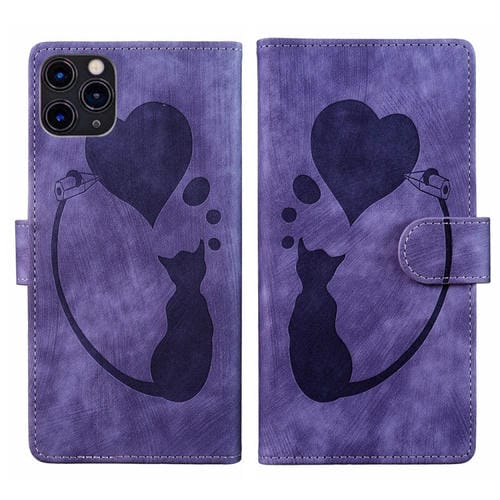 Funda de Cuero para iPhone 11 Pro Pen Heart Cat en Relieve (Púrpura)