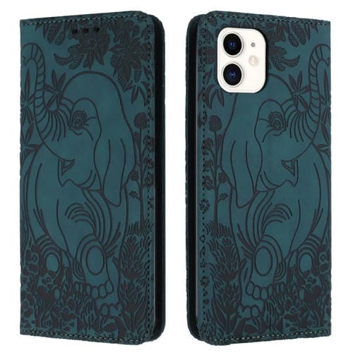Funda de Teléfono para iPhone 12/12 Pro Cuero con Relieve de Elefante Retro (Verde)