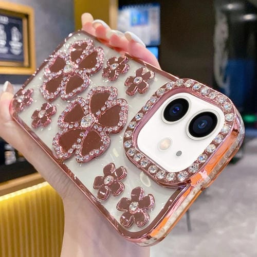 Funda para Teléfono TPU iPhone 12 con Diamantes y Flores Galvanizadas (Rosa)