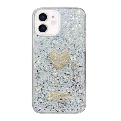 Funda para Teléfono TPU Epoxi para iPhone 12 con Corazón de Diamante y Lentejuelas Estrelladas (Plateado)