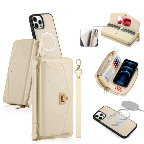 Funda para Teléfono iPhone 12 Pro Magsafe Crossbody con Billetera y Cremallera Multifuncional Cuero Litchi (Blanco)