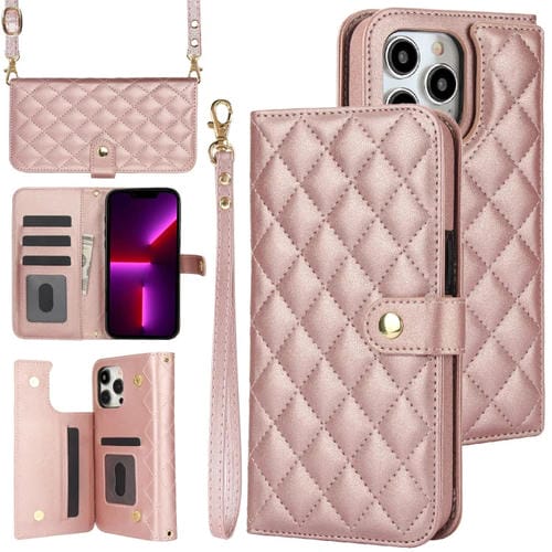 Estuche para Teléfono iPhone 12 Pro Max Crossbody Cuero Rómbico Multifunción (Oro Rosa)