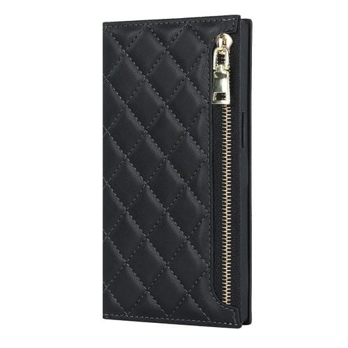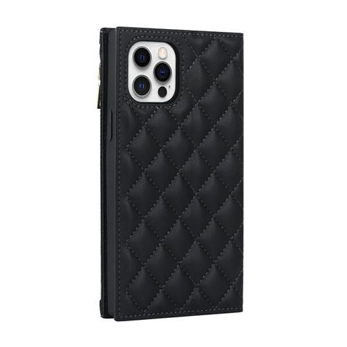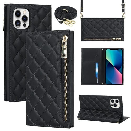 Funda de Cuero para iPhone 12 Pro Max Grid Texture con Lanyard y Cremallera (Negro)