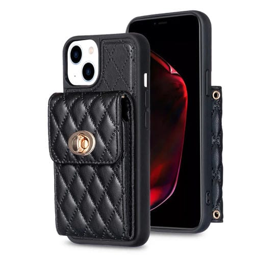 Caja de Teléfono de Cuero Rómbica para iPhone 13 Billetera con Hebilla de Metal Vertical (Negro)