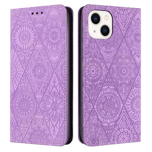 Estuche para Teléfono iPhone 13 Cuero Adsorción en Relieve Étnico (Púrpura)