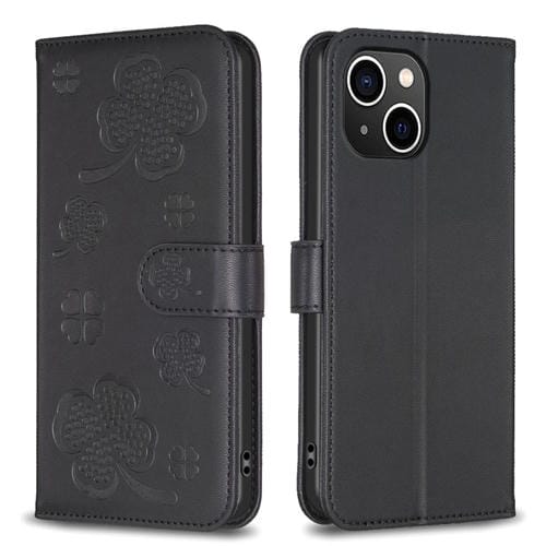 Funda para Teléfono iPhone 13 Cuero En Relieve Cuatro Hojas (Negro)