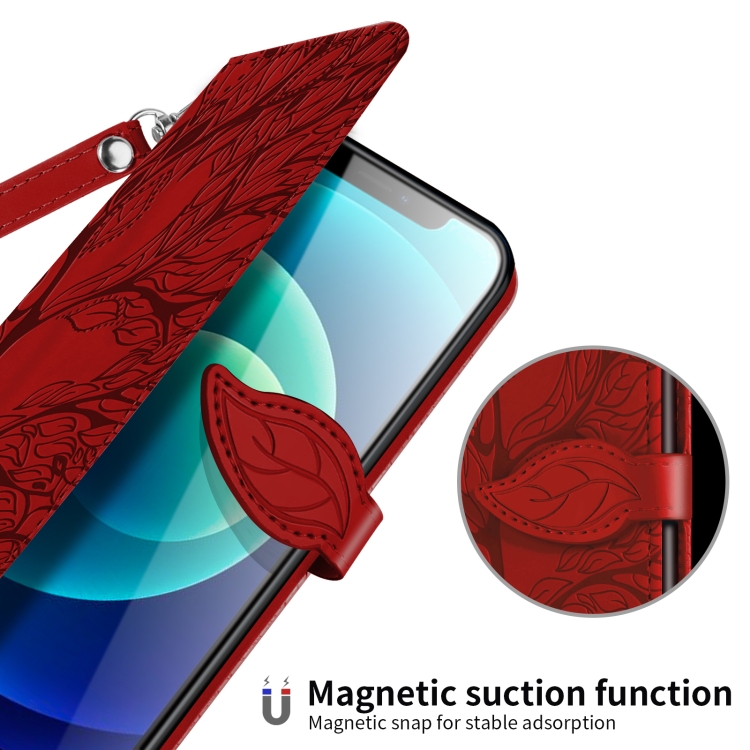 Estuche de Cuero para iPhone 13 Mini Life Of Tree con Tapa Horizontal, Soporte, Ranura para Tarjeta, Billetera, Marco de Fotos y Cordón (Rojo)