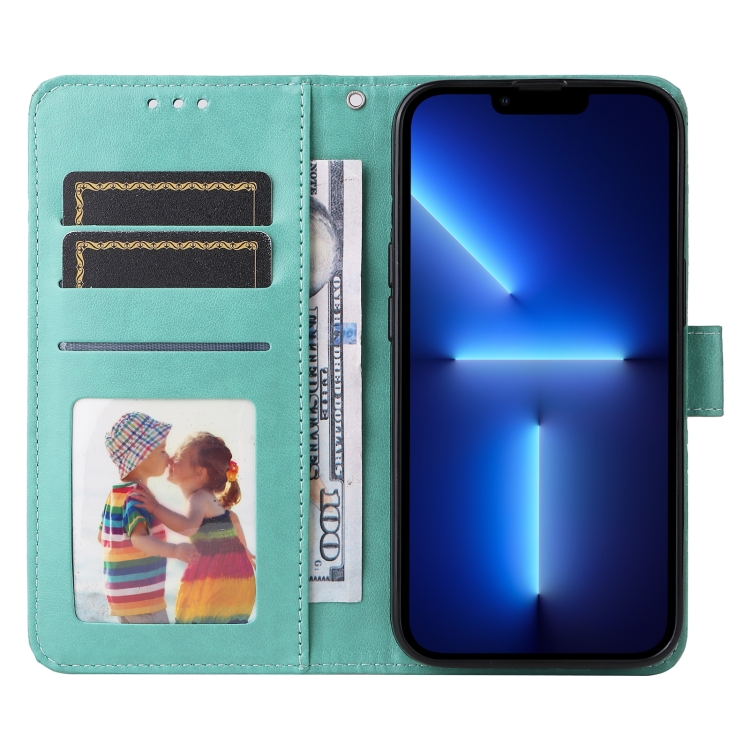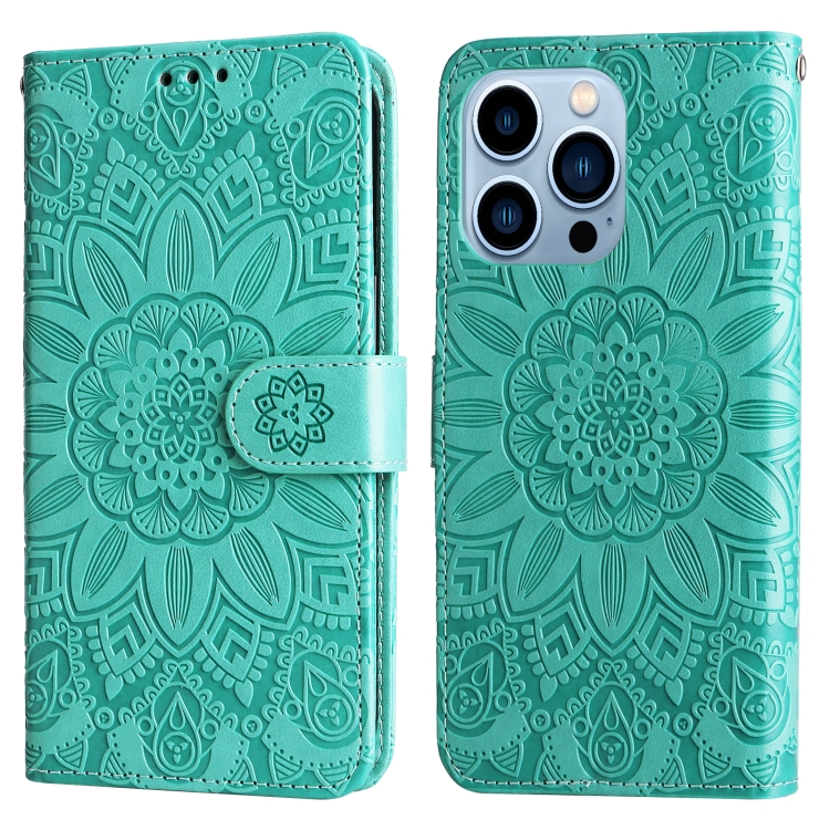 Estuche para teléfono iPhone 13 Pro Cuero Estampado de Girasol en Relieve (Verde)