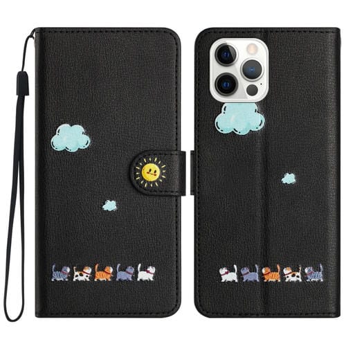 Funda de Cuero para Teléfono iPhone 13 Pro con Gatos de Dibujos Animados (Negro)