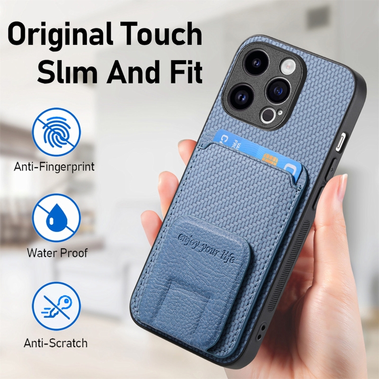 Funda para Teléfono iPhone 13 Pro Max Soporte Plegable Bolsa Tarjetas Fibra de Carbono (Azul)