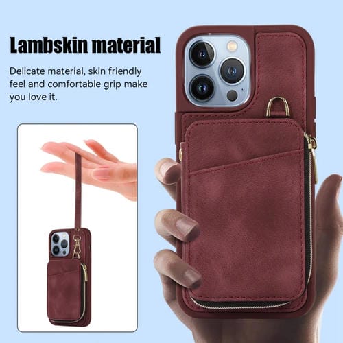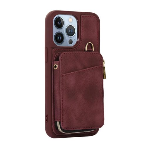 Funda para Teléfono iPhone 13 Pro Max Zipper Card Bag Contraportada (Rojo Vino)