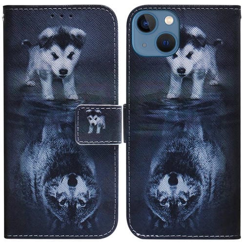 Estuche de Teléfono iPhone 14 Cuero con Tapa Dibujo Coloreado Lobo y Perro