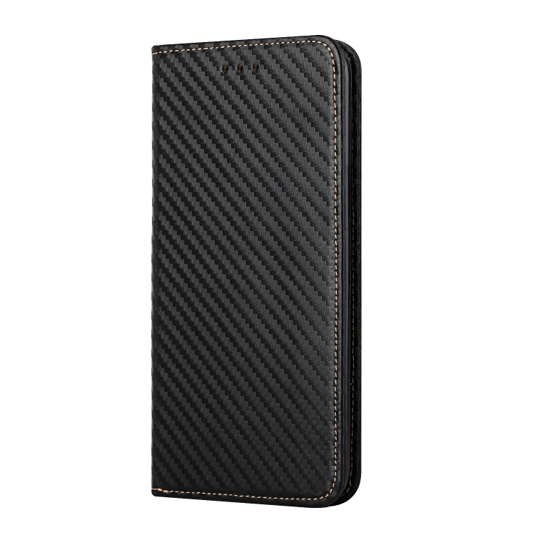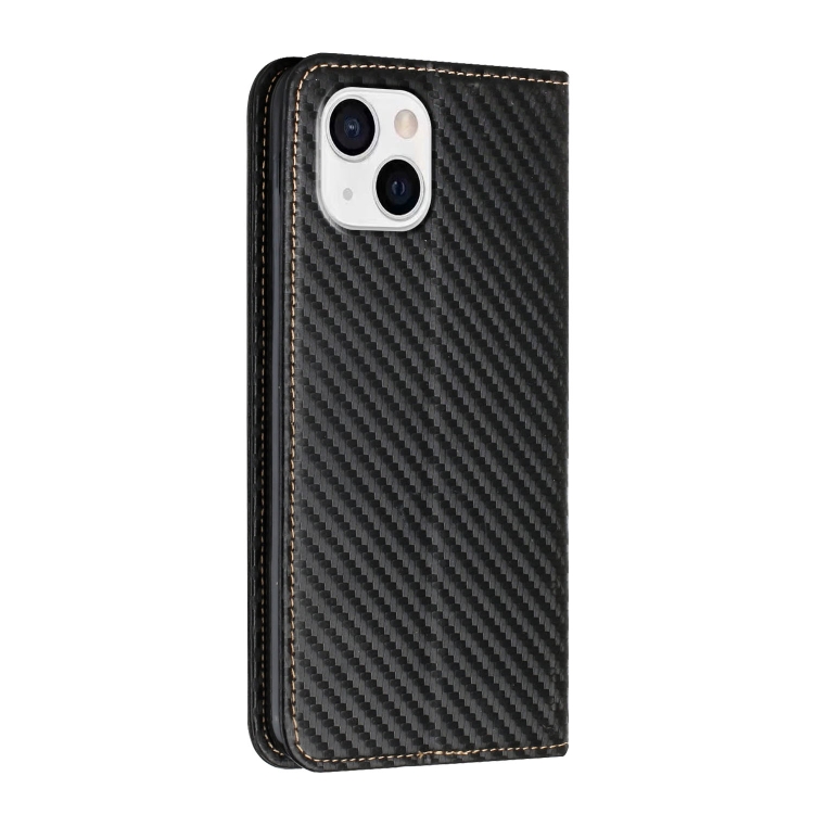 Funda de Cuero para iPhone 14 con Tapa Magnética y Textura de Fibra de Carbono (Negro)