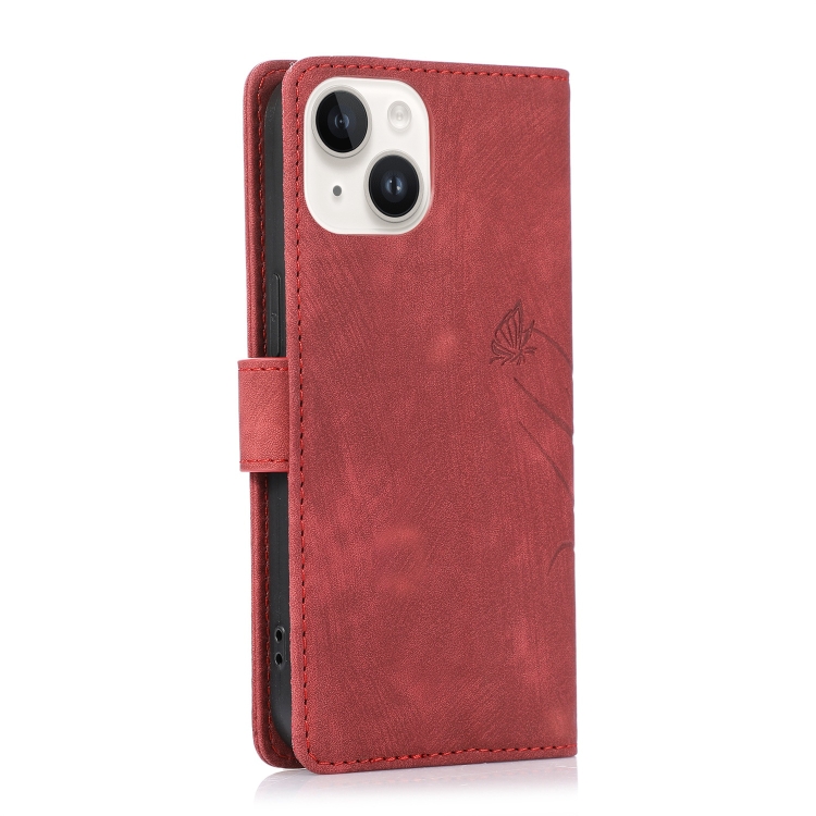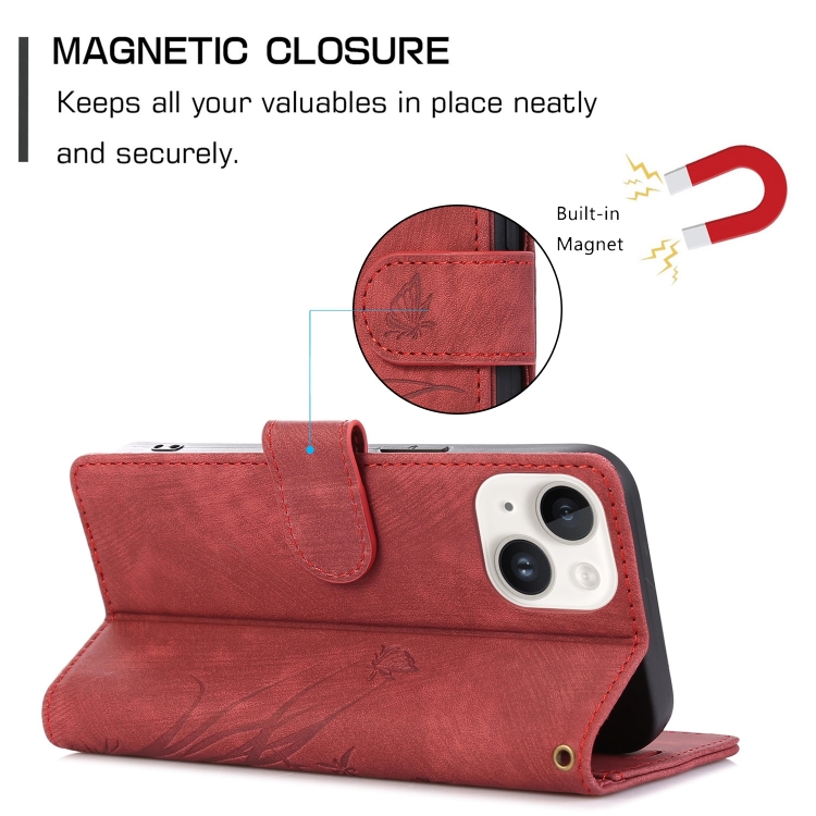 Funda para Teléfono iPhone 14 Cuero Relieve Mariposa Orquídea (Rojo)
