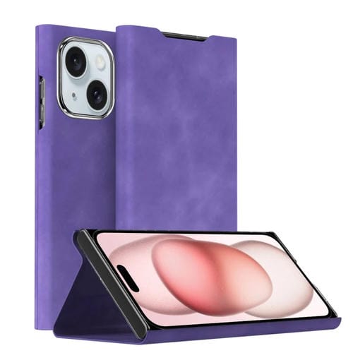 Funda para iPhone 15 Magnética de Cuero con Textura de Napa y Soporte (Púrpura)