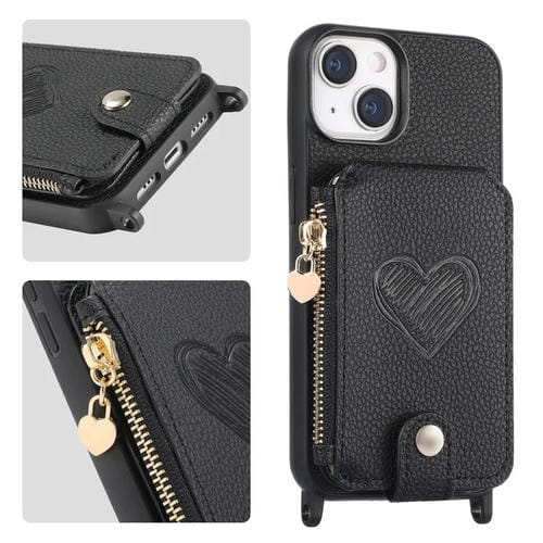 Funda para Teléfono iPhone 15 Parte Trasera de Cuero con Cremallera y Amor Cruzado (Negro)