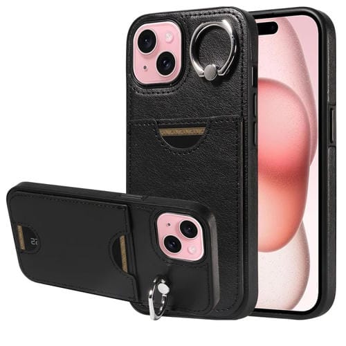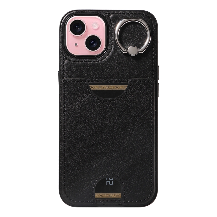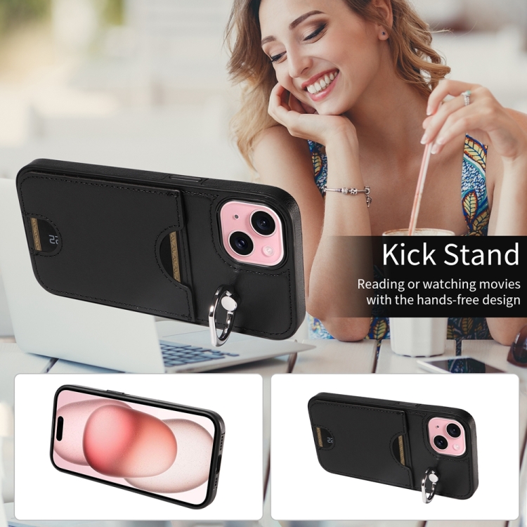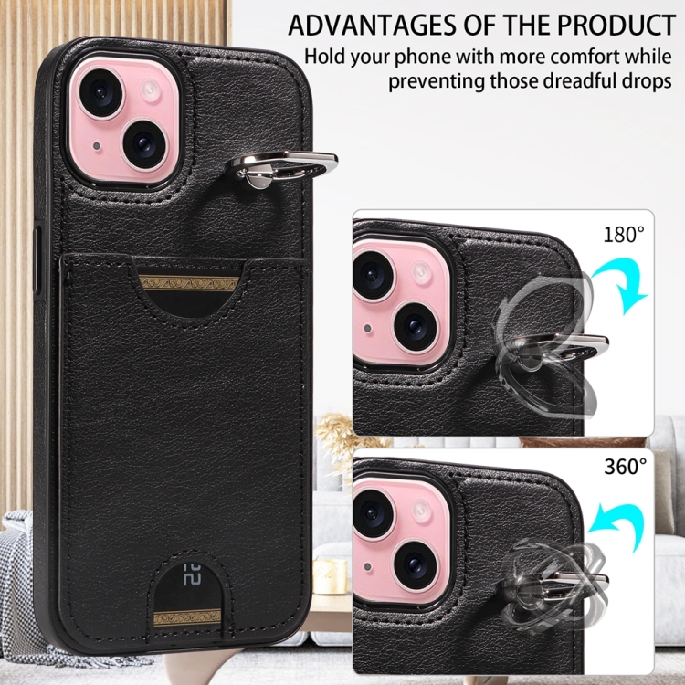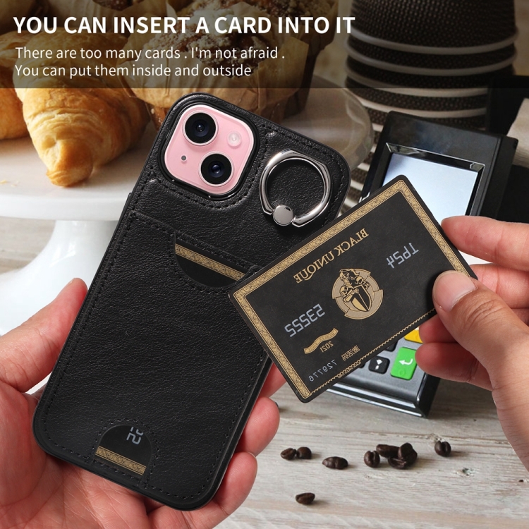 Funda para Teléfono iPhone 15 con Soporte para Anillo y Ranura para Tarjeta (Negro)