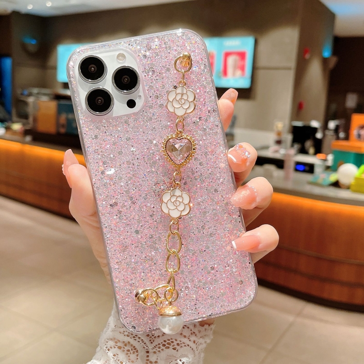 Funda para Teléfono TPU Epoxi iPhone 15 Cadena Gemas Amor Lentejuelas (Rosa)
