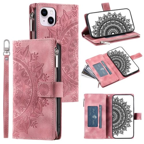 Funda de Cuero para iPhone 15 Multi-Card Totem con Cremallera (Rosa)