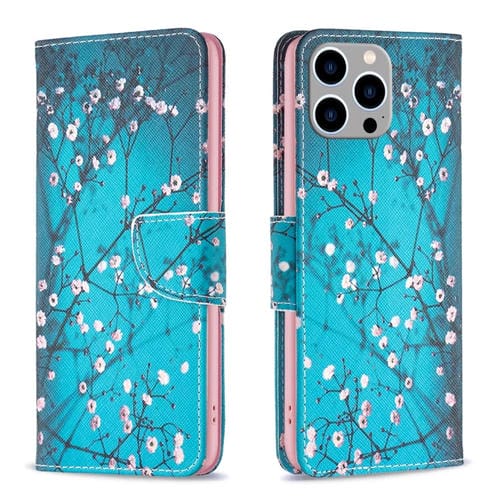 Estuche para Teléfono iPhone 15 Pro Max Cuero con Patrón de Dibujo Coloreado (Flor del Ciruelo)