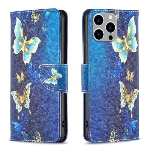 Funda de Cuero para iPhone 15 Pro Max con Tapa Patrón de Dibujo Coloreado (Mariposa Dorada)