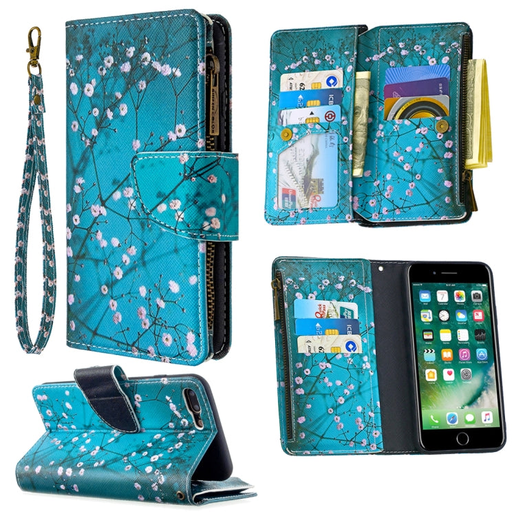 Funda de Cuero iPhone 8 Plus y 7 Plus Patrón Dibujo Colores Cremallera Tapa Horizontal Soporte Ranuras Tarjetas Billetera (Plum Blossom)