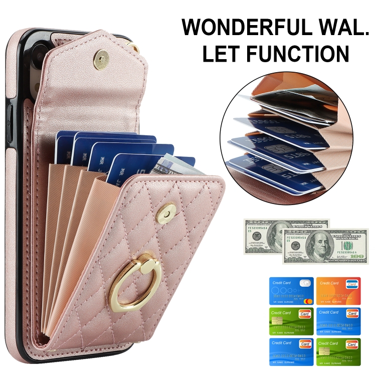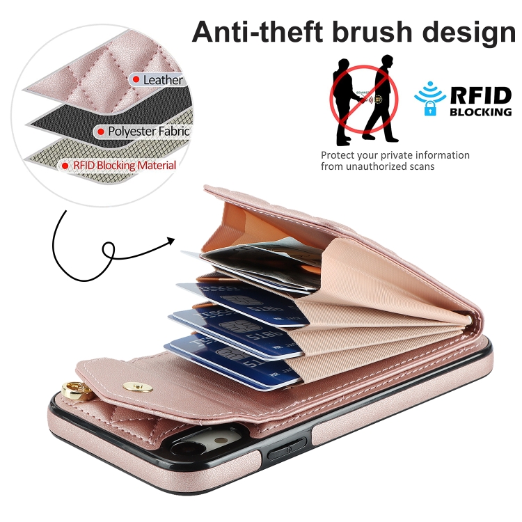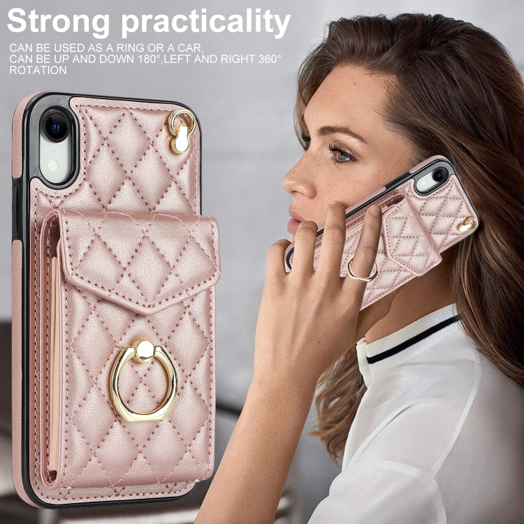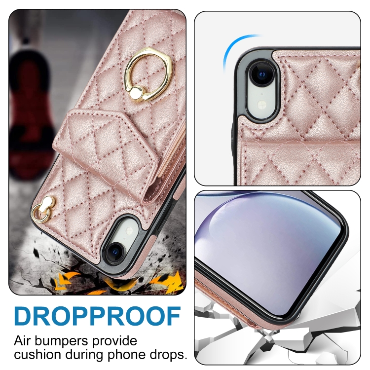 Funda para Teléfono iPhone Xr Rhombic Texture Card Bag con Cordón Largo (Oro Rosa)