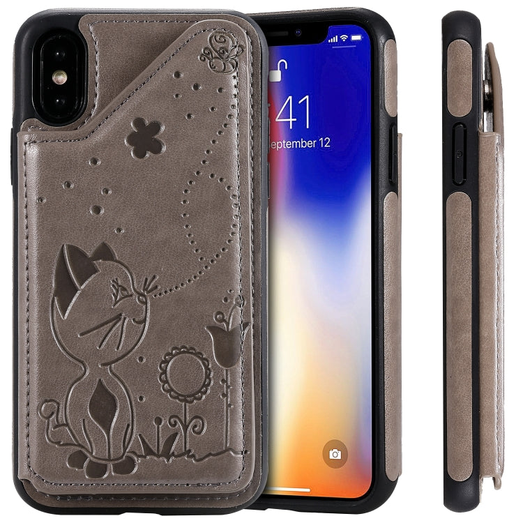 Estuche protector iPhone Xs Cat Bee patrón relieve a prueba de golpes con ranuras para tarjetas (Gris)