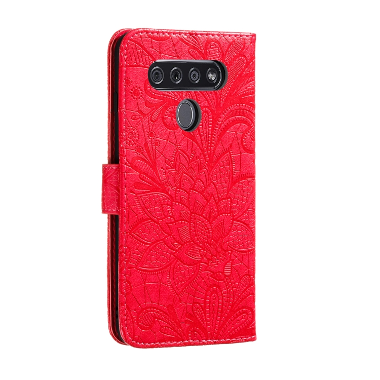 Funda de Cuero para LG K51S Lace Flower con Tapa Horizontal, Soporte, Ranuras para Tarjetas y Billetera (Rojo)