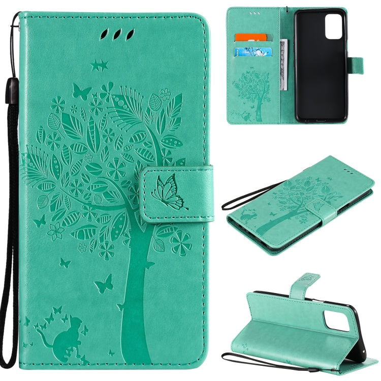 Funda Cuero PU LG K52 Árbol y Gato Impresión Prensado con Soporte, Billetera y Cordón (Verde)