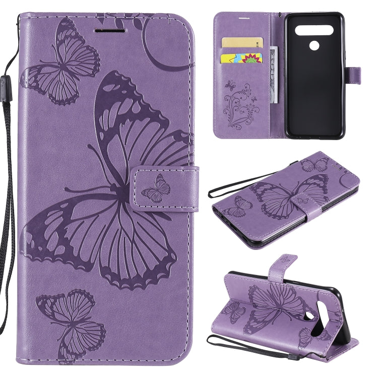 Funda de Cuero para LG K61 3D Mariposa en Relieve con Tapa Horizontal, Soporte, Ranura para Tarjeta, Billetera y Cordón (Púrpura)