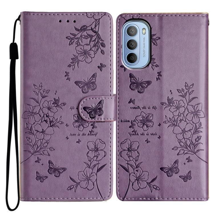 Funda de Cuero para Motorola Moto G62 5G con Mariposas y Flores (Púrpura)