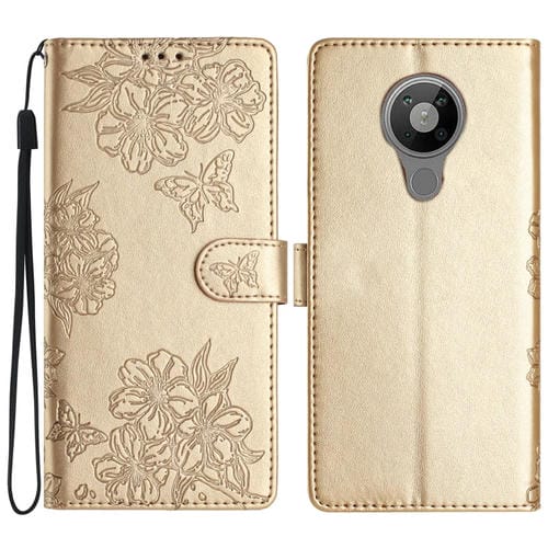 Funda para Nokia 5.4 Cherry Blossom Butterfly Skin Feel de PU en Relieve (Oro)