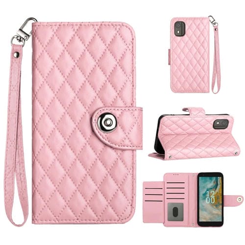 Funda de Cuero para Nokia C02 con Tapa Textura Rómbica y Cordón (Rosa)