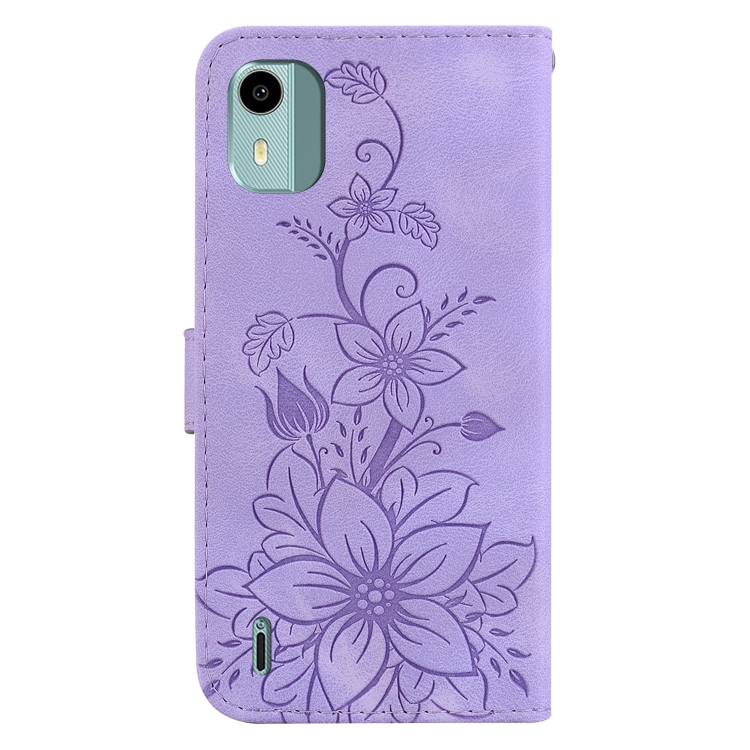 Funda de Teléfono para Nokia C12 Lily de Cuero en Relieve (Púrpura)
