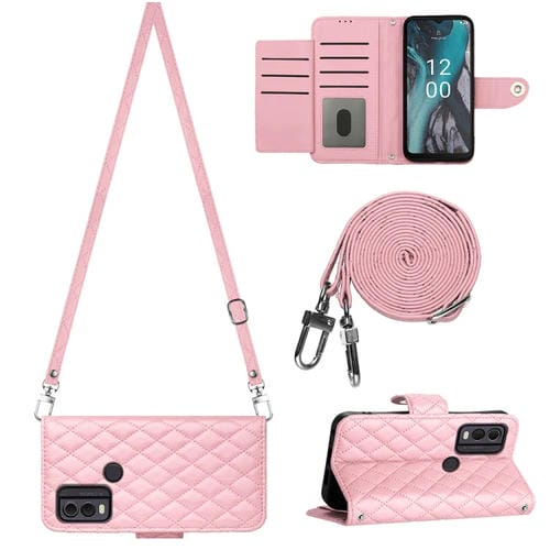Funda de Cuero para Nokia C22 con Tapa, Textura Rómbica y Cordón Largo (Rosa)