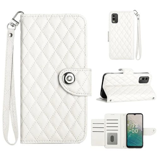 Funda de Cuero para Nokia C32 con Tapa, Textura Rómbica y Cordón (Blanco)