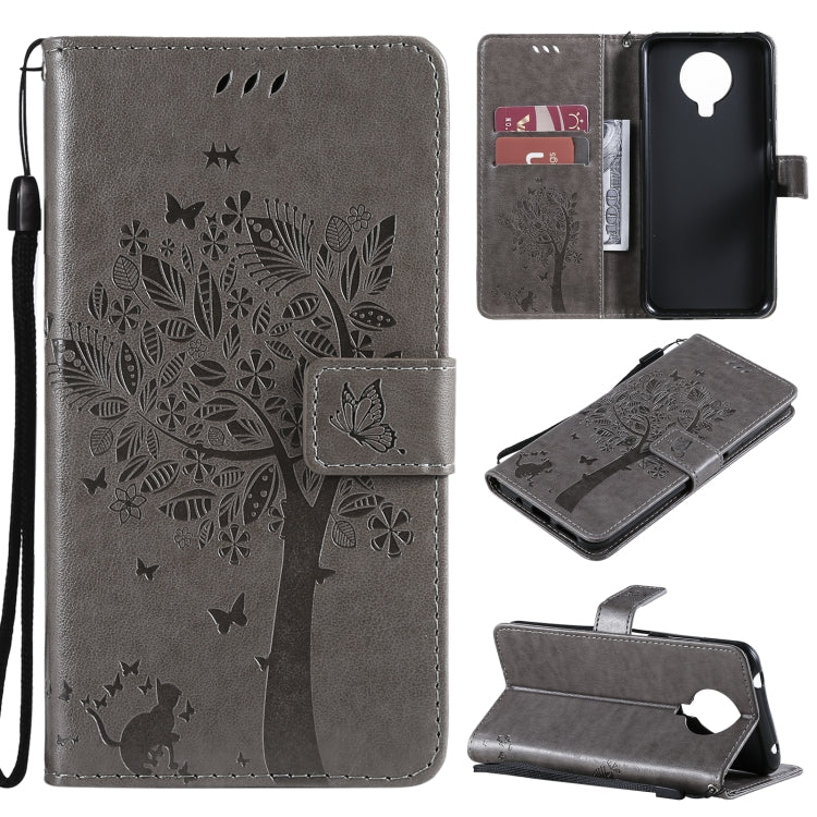 Para Nokia G10 Árbol y patrón de gato Impresión prensada Funda de cuero Horizontal Flip PU con soporte y tragamonedas y billetera y cordón (gris)
