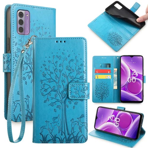 Funda para Nokia G42 5G de Cuero con Relieve de Árbol y Ciervo (Azul)