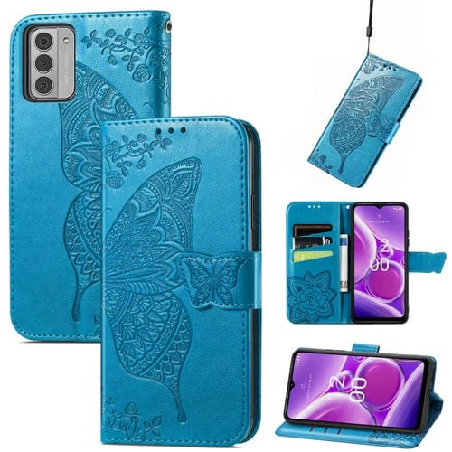 Funda para Nokia G42 de Cuero con Relieve de Flor y Mariposa (Azul)