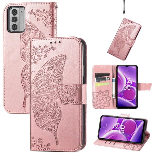 Funda para Teléfono Nokia G42 de Cuero con Relieve Flor de Amor y Mariposa (Oro Rosa)
