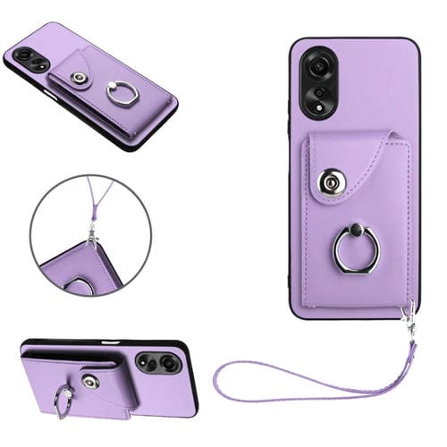Para Oppo A38 4G / A18 4G Bolsa de Tarjeta de Órgano Global Soporte de Anillo Funda para Teléfono de Pu con Cordón (Púrpura)