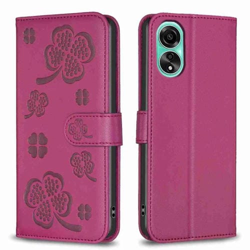 Para Oppo A78 4G Funda de Teléfono de Cuero con Relieve de Cuatro Hojas (Rojo Rosa)